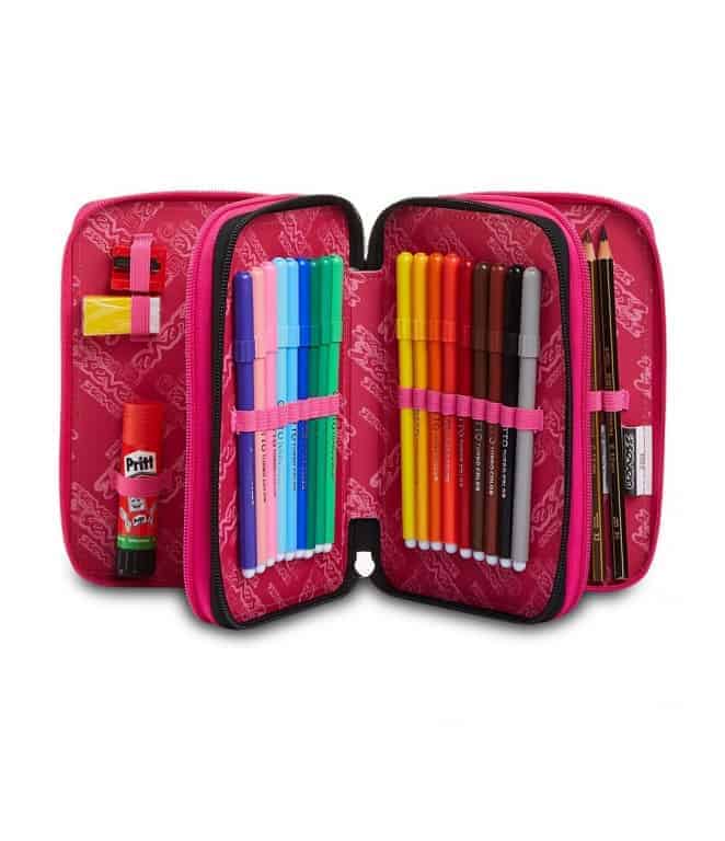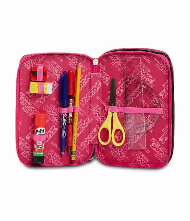 L’astuccio Seven 3 zip ha tre scomparti in cui troverai tutto il materiale necessario per la tua giornata di scuola: 1 penna cancellabile PILOT FRIXION ball 0,7 con inchiostro di colore blu, 1 penna a sfera FILA TRATTO 1GRIP con inchiostro di colore rosso, 18 pennarelli GIOTTO TURBOCOLOR, 18 pastelli a colori GIOTTO SUPERMINA, 1 matita grafite LYRA TEMAGRAPH, 1 colla stick PRITT , 1 gomma, 1 temperino, 1 righello trasparente, 1 goniometro trasparente, 1 forbice in metallo con maniglia in plastica. A te non resta altro che abbinarlo a uno zaino o a un trolley Seven.