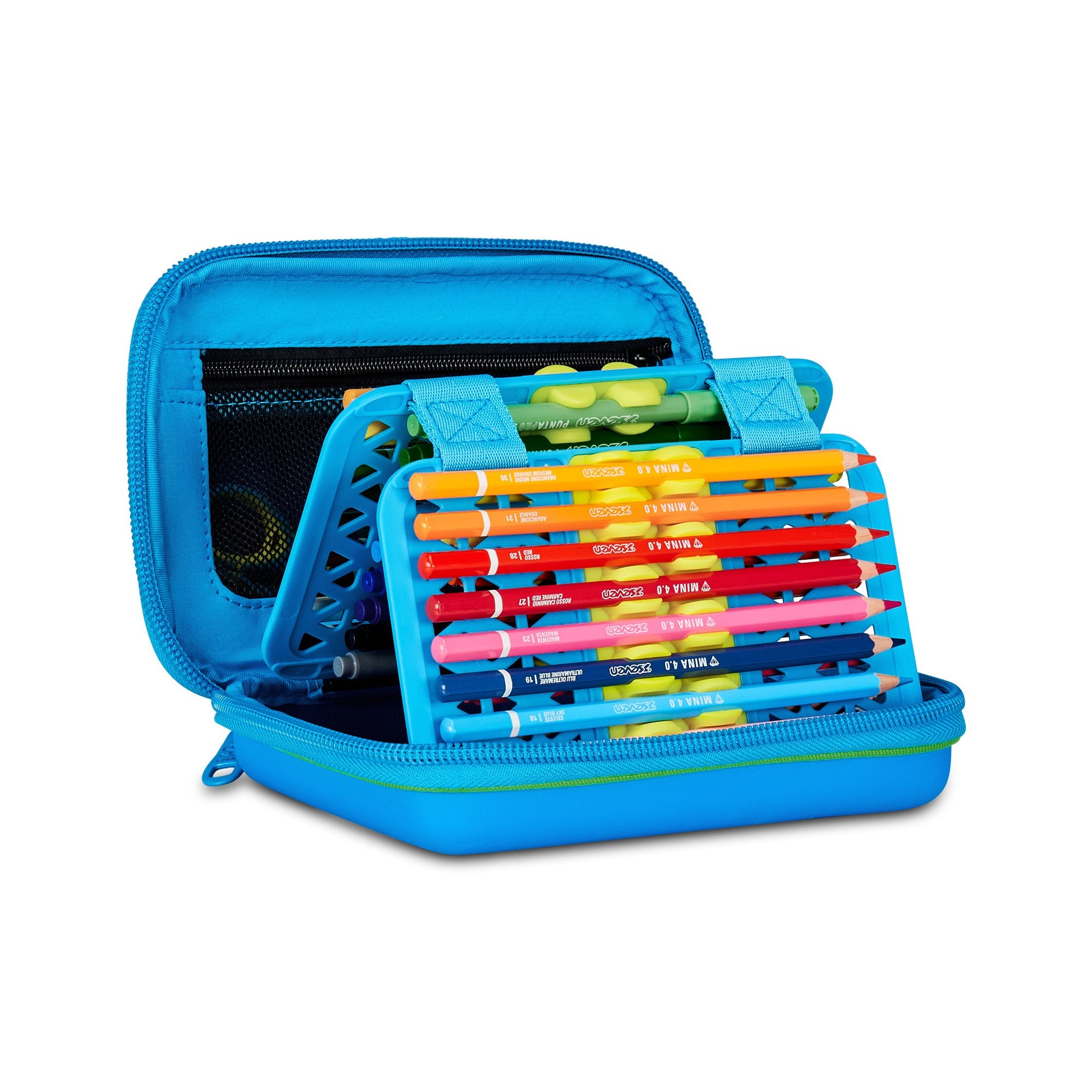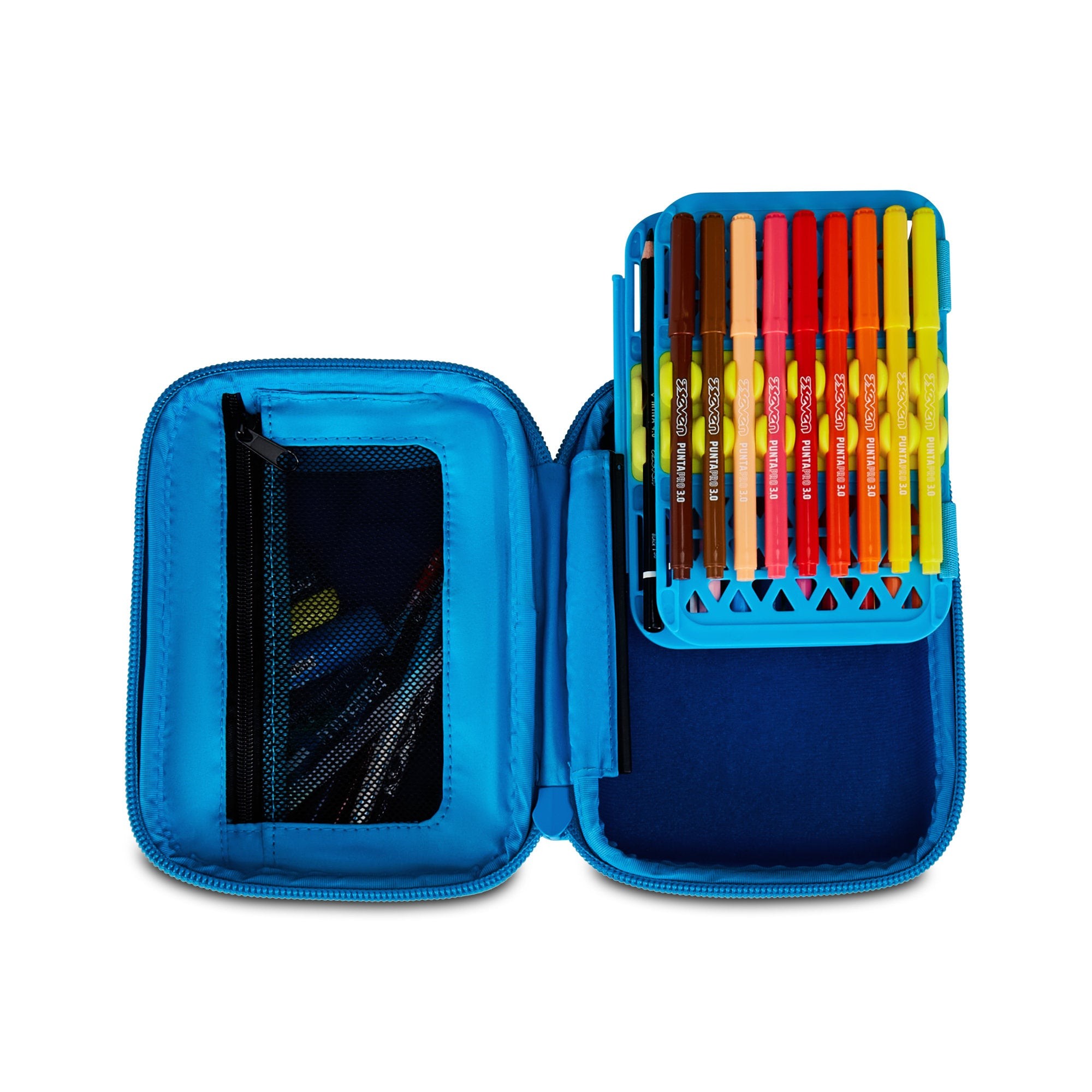 Offre una pratica apertura con maxi zip e plance dotate di un sistema a incastro, senza elastici, per inserire penne e matite in modo semplice e ordinato all’interno dell’apposita bustina.