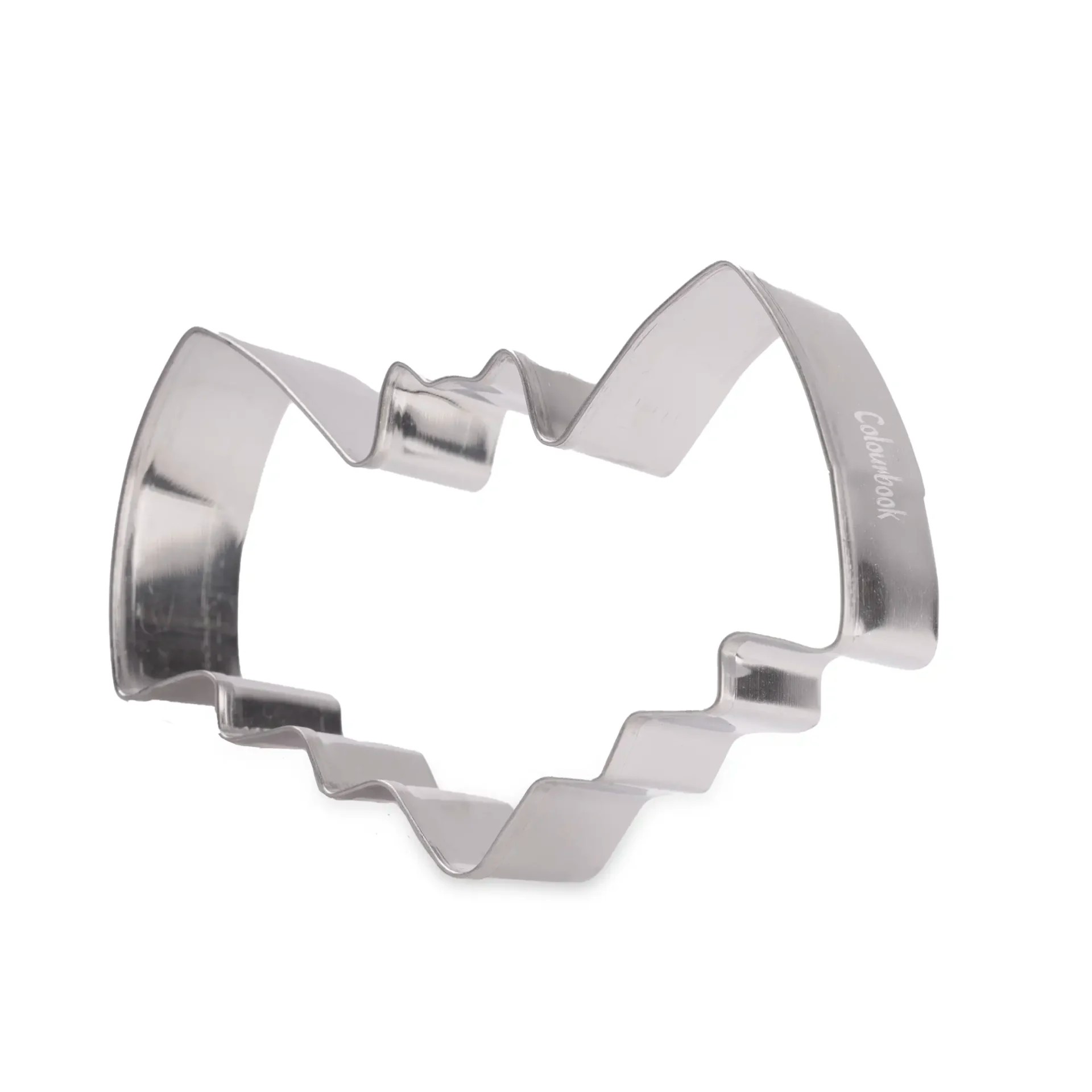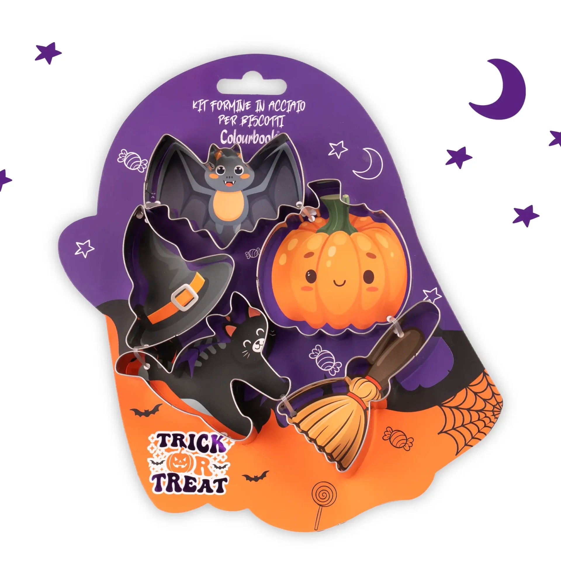 5 formine in acciaio inox per alimenti: pipistrello, zucca, cappello da strega, gatto e scopa.