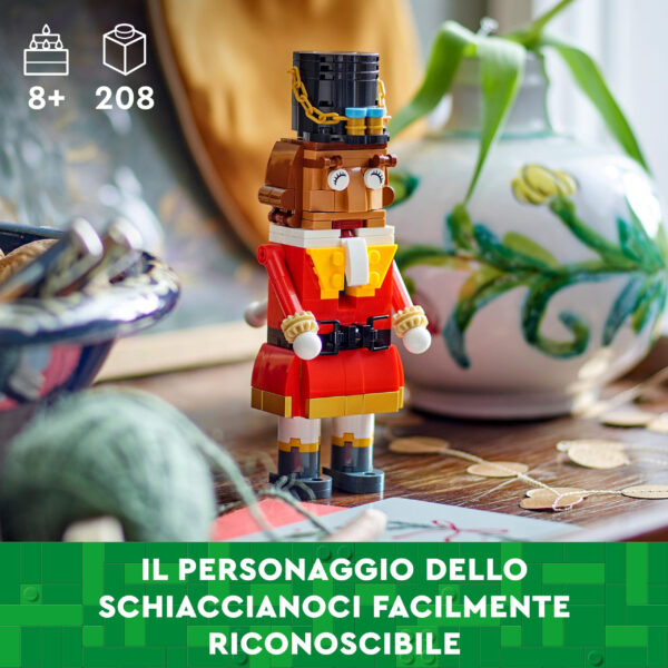 Questa versione LEGO del famoso Schiaccianoci può essere assemblata con un volto maschile o femminile, ed è caratterizzata da braccia mobili e una bocca che si apre.