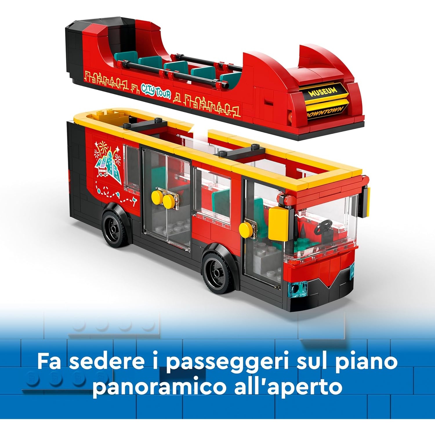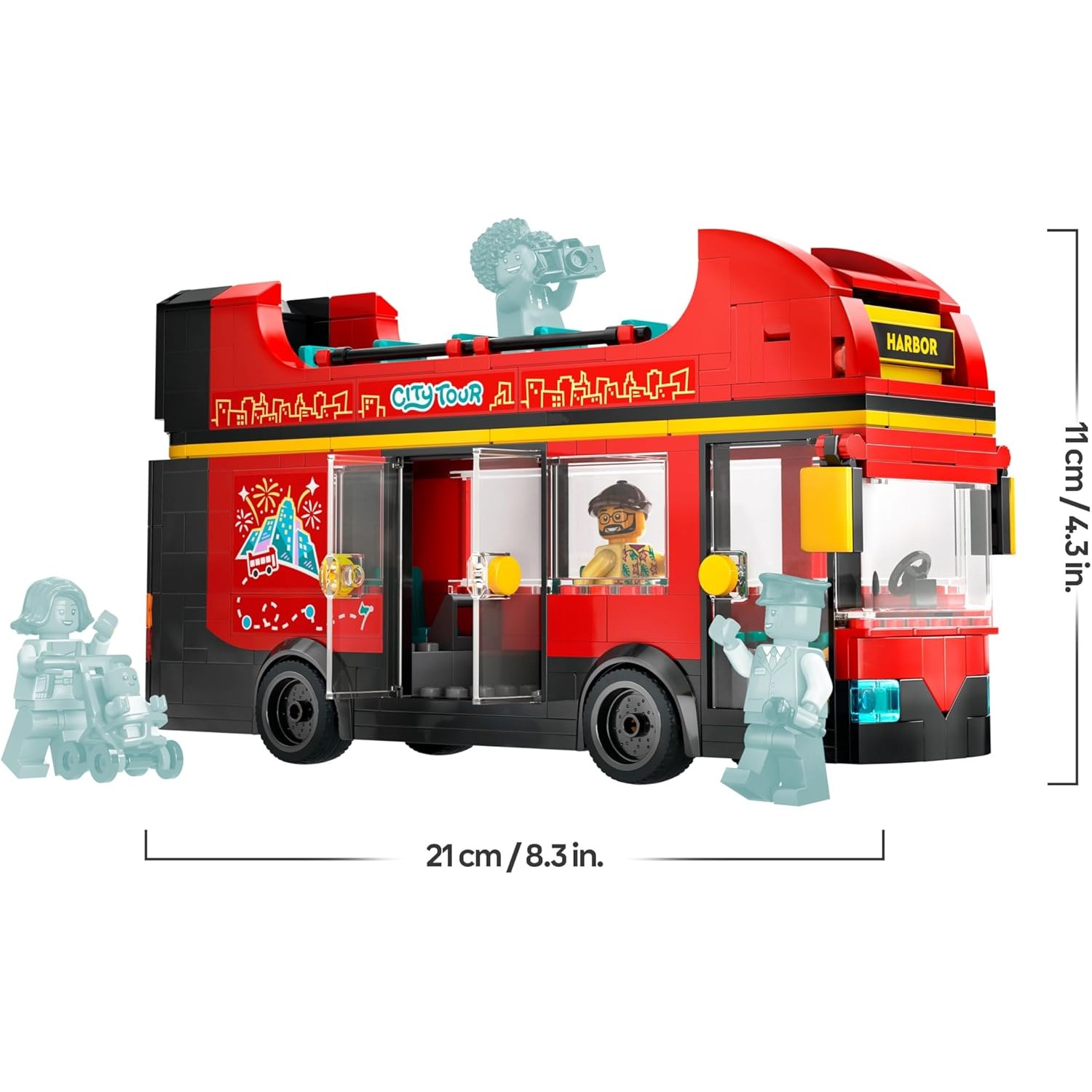 Parti per un’avventura urbana con questo fantastico Autobus turistico rosso a due piani LEGO® City! Perfetto per bambini dai 7 anni in su, questo set regala ore di divertimento e stimola la creatività.