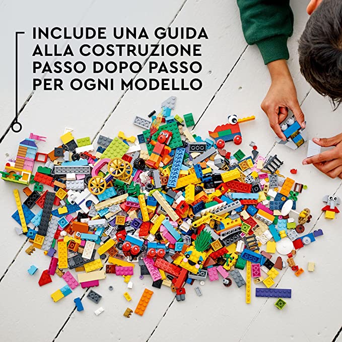 Scatena la creatività dei bambini con questo fantastico set di gioco di 500 pezzi, contenente un’incredibile gamma di elementi LEGO® trasparenti, oltre ai classici mattoncini LEGO, occhi e ruote per creare 8 divertenti modelli e altro ancora.