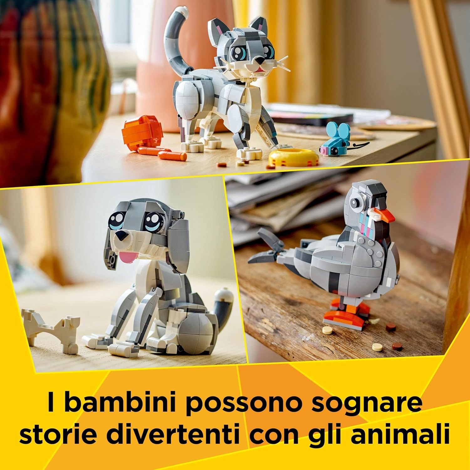 • Modelli versatili: Puoi realizzare tre animali diversi: un vivace gatto LEGO, un allegro cane giocattolo e un curioso piccione. Ricorda che non è possibile costruire tutti i modelli contemporaneamente.