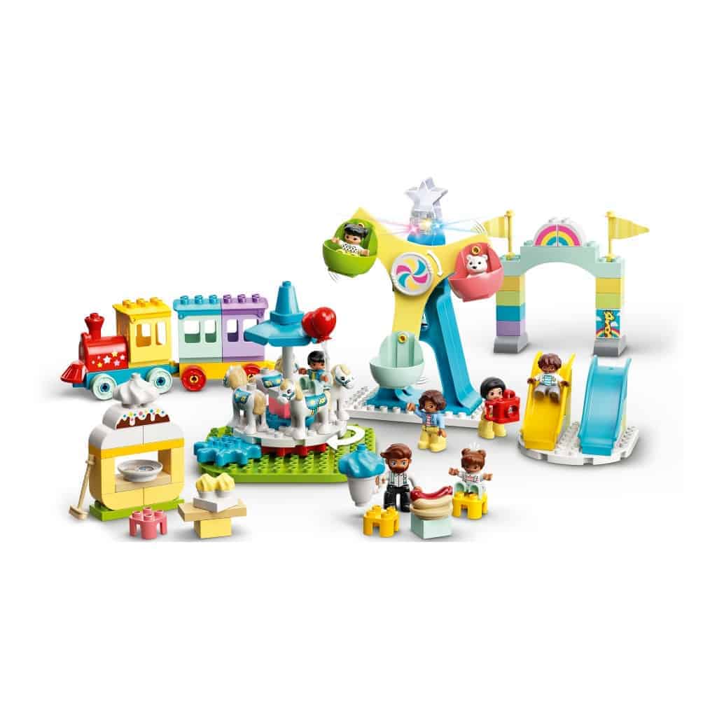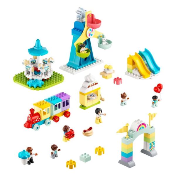 Include 7 personaggi DUPLO® (2 donne, 1 uomo e 4 bambini), 2 scivoli, una giostra meccanica, una ruota panoramica che gira con 3 colorate cabine, un treno a spinta e tanti divertenti accessori.
