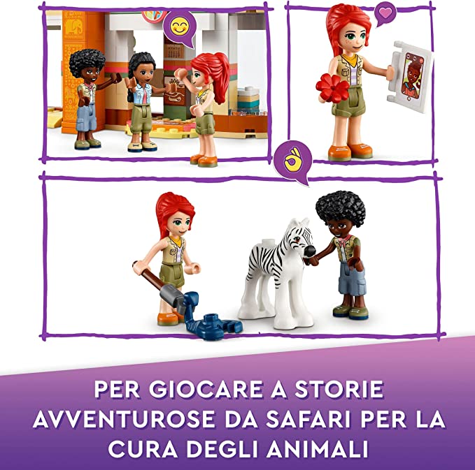 La chiamata della zebra ferita arriva sul walkie-talkie e i soccorsi sono subito pronti a partire. Tornati al centro, i bambini aiutano la dottoressa a utilizzare il kit medico per esaminare l’animale. Questo set creativo è un magnifico regalo di compleanno per i piccoli amanti di animali selvaggi e include una zebra, uno scorpione e una giraffa. Ci sono anche 3 mini-doll con cui ricreare scene di azione e di accudimento degli animali.
