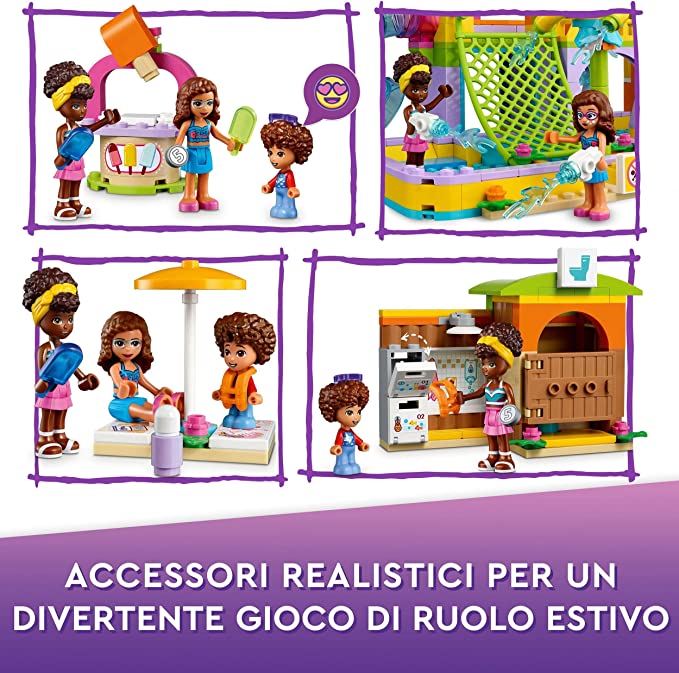I bambini che amano i divertimenti estivi rimarranno conquistati dal LEGO® Friends Parco acquatico (41720). I piccoli costruttori dai 6 anni in su potranno ricreare tutte le emozioni di una piscina all’aperto grazie a questo modello in mattoncini ricco di giocattoli perfetti per lunghe ore di gioco creativo.