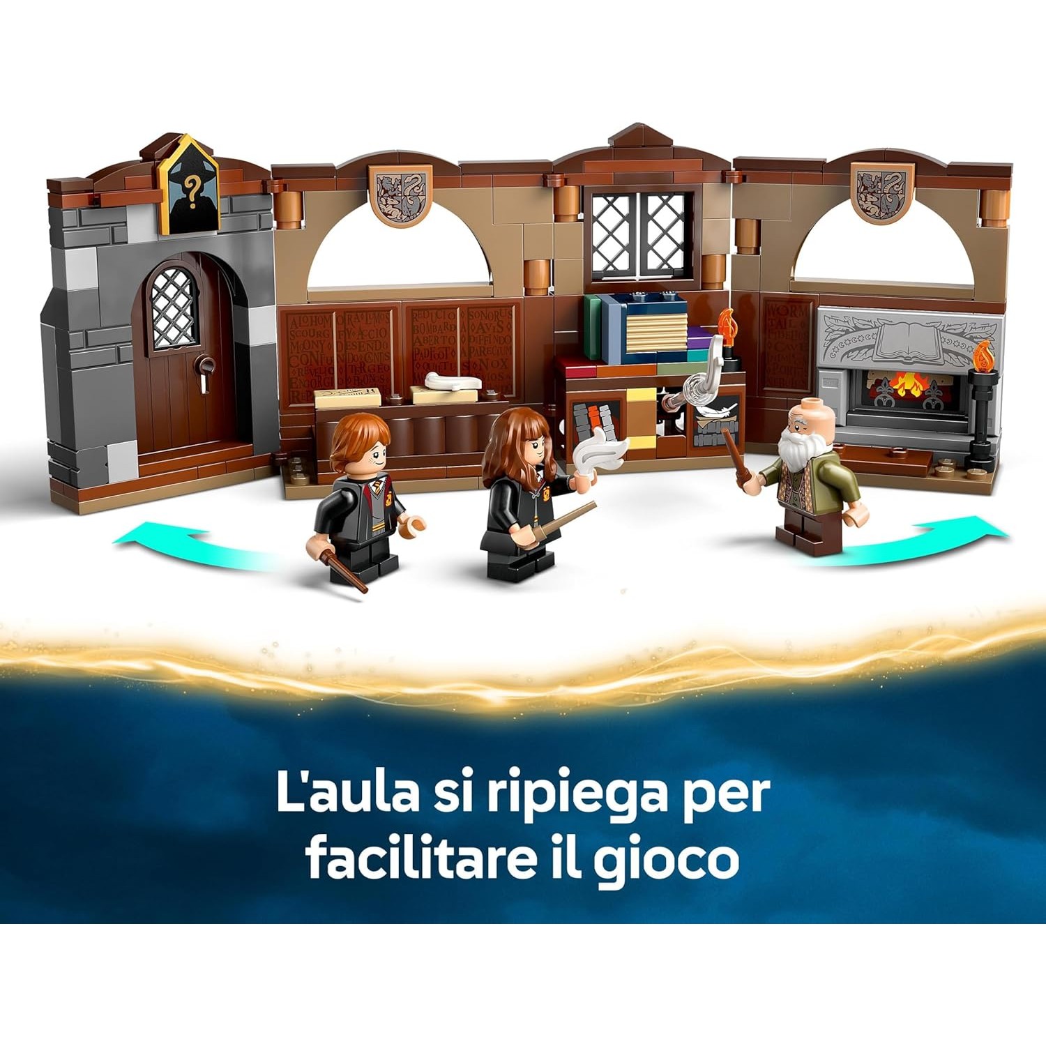 Struttura con costruzioni LEGO Harry Potter: l’aula si apertura per facilitare il gioco e presenta la funzione di levitazione delle piume con Wingardium Leviosa, insieme a banchi removibili e una lavagna con le istruzioni per vari incantesimi.