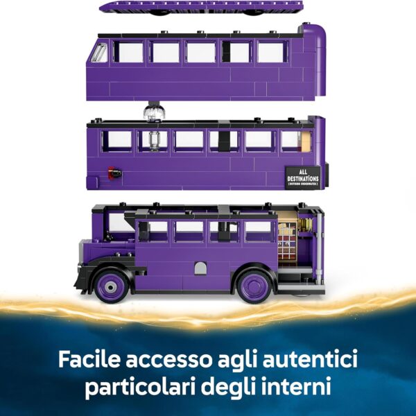 Modello di veicolo magico LEGO in mattoncini: l’autobus Nottetempo è ricco di dettagli interessanti; i piani superiori possono essere staccati per facilitare l’accesso all’interno, dove si trovano letti mobili e un lampadario che si dondola.