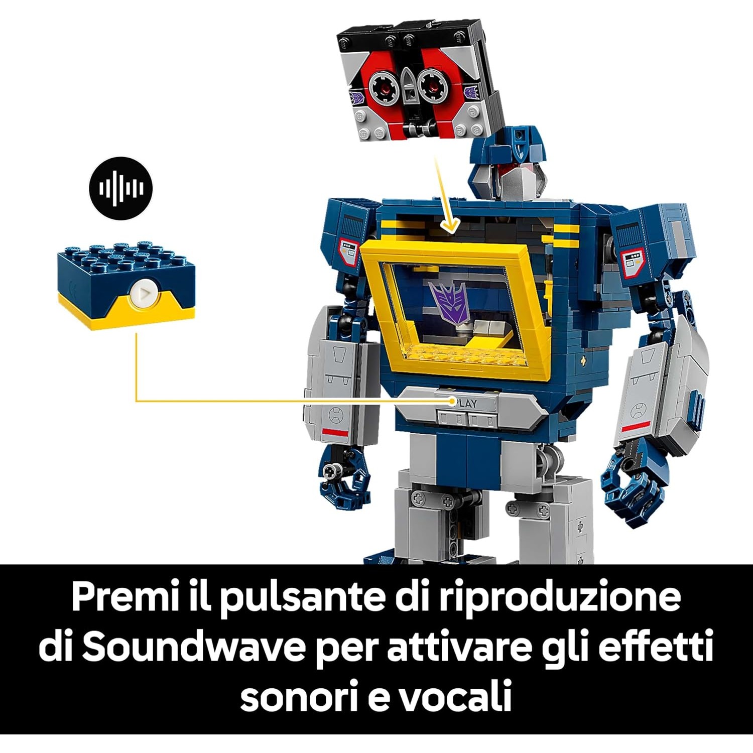 - Include la figura LEGO di Soundwave con una capsula a razzo, un blaster laser e accessori per i dardi, oltre alle figure di Ravage e Laserbeak.