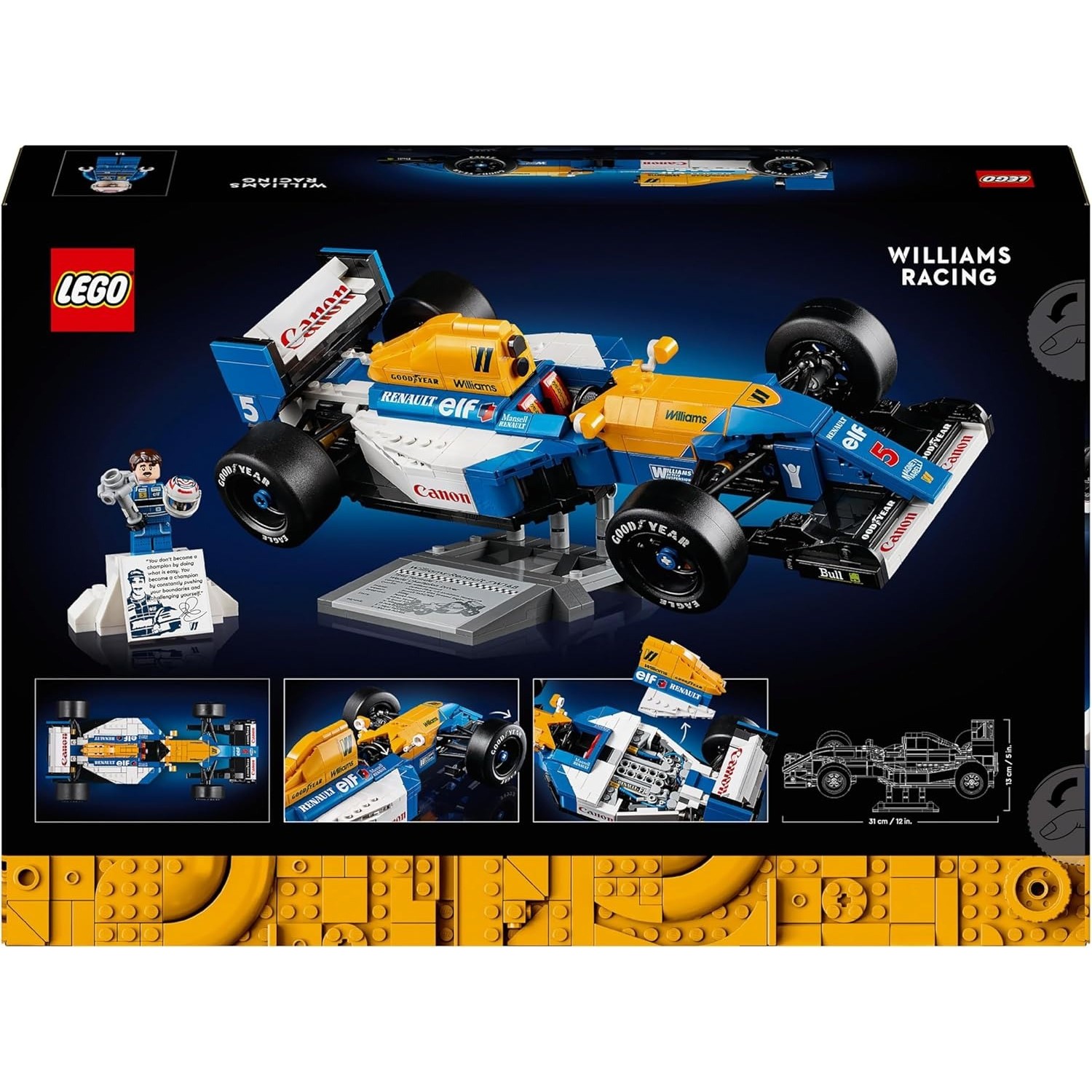 Contenuto del set: monoposto da costruire, minifigure di Nigel Mansell, espositore, podio, casco e trofeo.