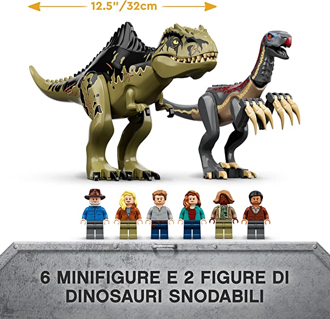 I fan di Jurassic World: Dominion possono rivivere i momenti pieni d’azione del film, con questo incredibile playset l’Attacco del Giganotosauro e del Terizinosauro (76949). Il set contiene 2 nuovi dinosauri giocattolo, un quartier generale da costruire con un laboratorio ricco di dettagli, un garage per il fuoristrada giocattolo, una torre di osservazione con piattaforma pieghevole, un elicottero con rotori funzionanti e vano di carico. Un regalo fantastico per tutti i bambini fan dell’universo LEGO Jurassic World dai 9 anni in su.