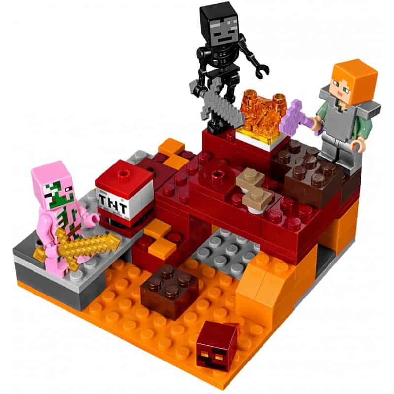 Include 2 minifigure LEGO® Minecraft™: Alex e il pigman zombie, più uno scheletro wither e piccoli cubi di magma.