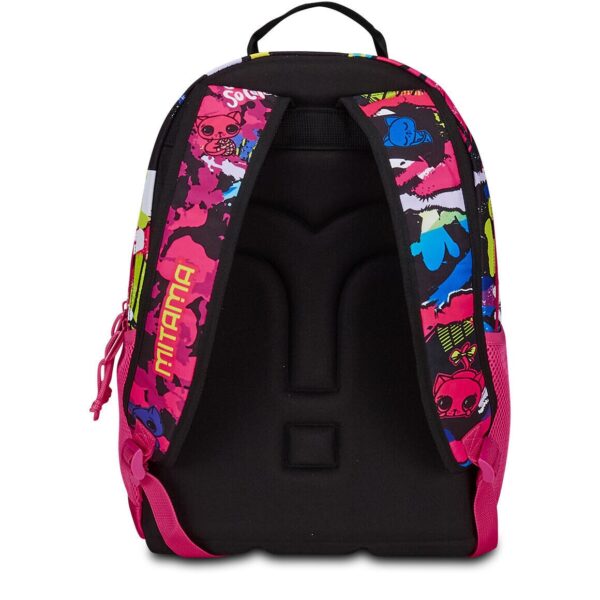 Altre caratteristiche: Zaino a tre scomparti con schienale robusto. La posizione degli spallacci, brevettata da Mitama, permette allo zaino di rimanere sollevato e si adatta perfettamente alla schiena dello studente anche durante il movimento. Elementi come paillettes brillanti, scritte laminate e tessuti gommati conferiscono allo zaino uno stile unico.