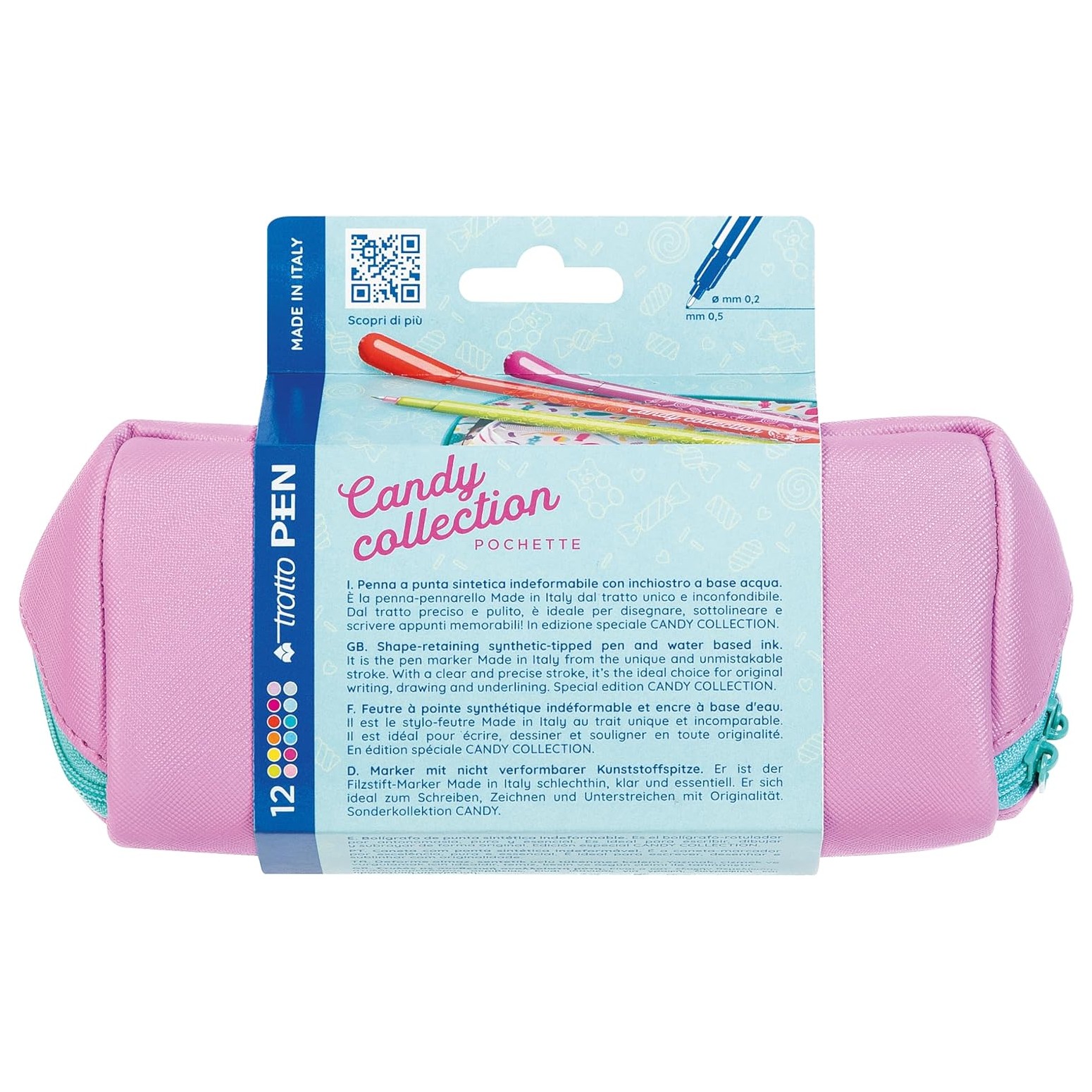 Le pochette CANDY sono bellissime fuori e coloratissime dentro: in due dimensioni, media (M) con 12 Tratto PEN Candy e maxi (XL) con manico e con 24 Tratto PEN Candy.