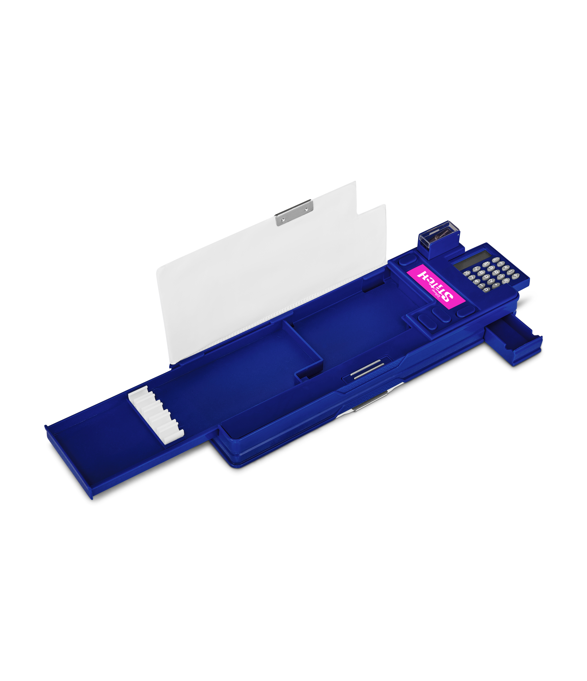 Dotato di scomparti a scomparsa che si aprono con un semplice gesto, offre spazio extra quando serve e si richiude facilmente per occupare meno posto nello zaino o sulla scrivania.