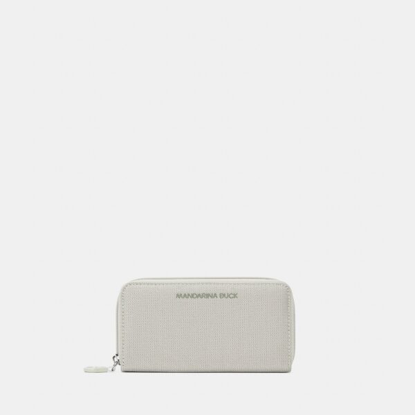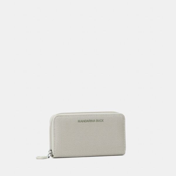Portafoglio zip around in mitrix, storico materiale del marchio Mandarina Duck caratterizzato da resistenza, versatilità ed effetto cangiante. Presenta numerosi vani per carte di credito e uno portamonete zippato. Il restyling degli accessori lo rende più contemporaneo.
