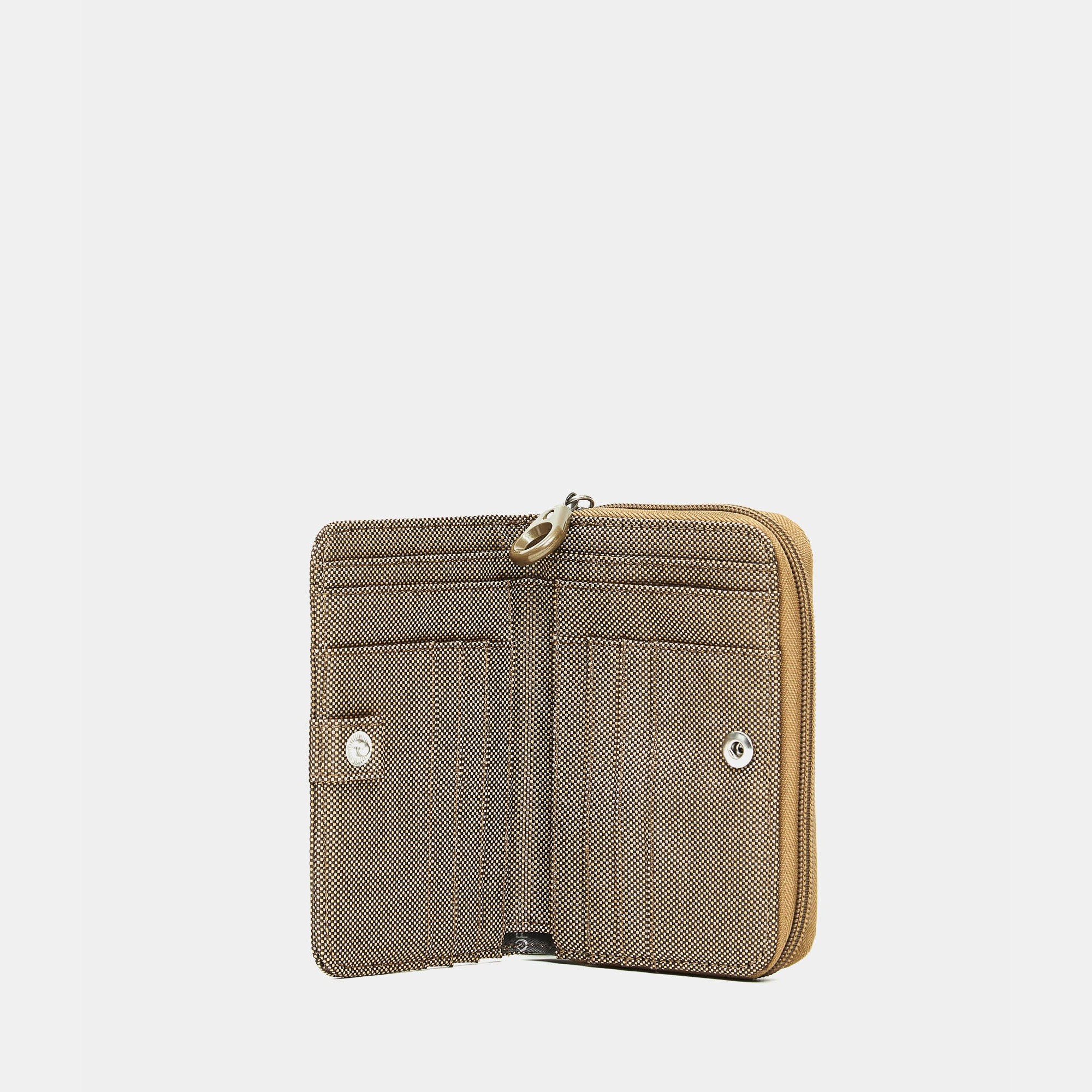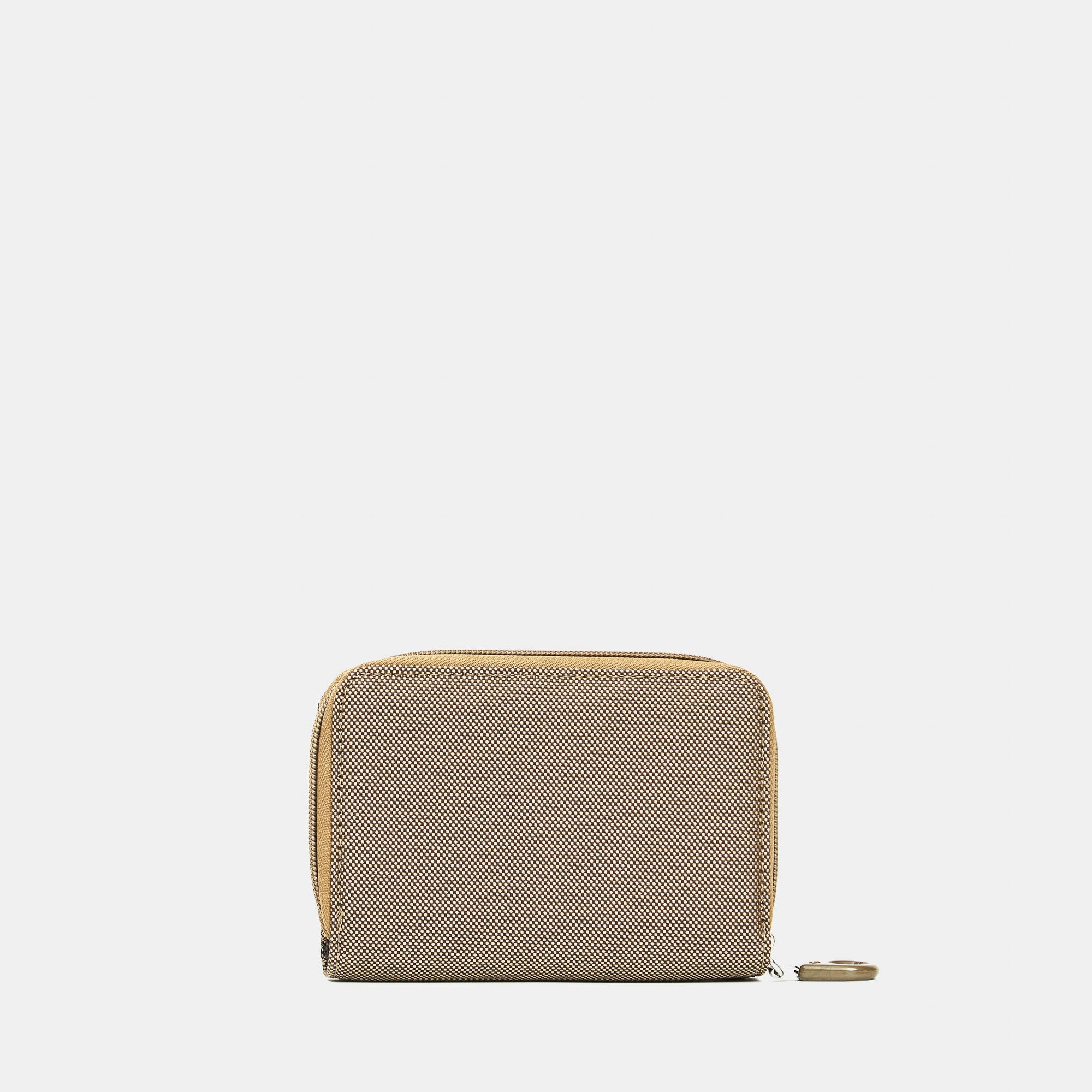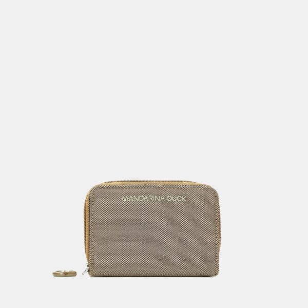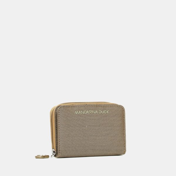 Piccolo portafoglio zip around in mitrix, storico materiale del marchio Mandarina Duck caratterizzato da resistenza, versatilità ed effetto cangiante. Presenta una patta con bottone a pressione per le carte di credito.
