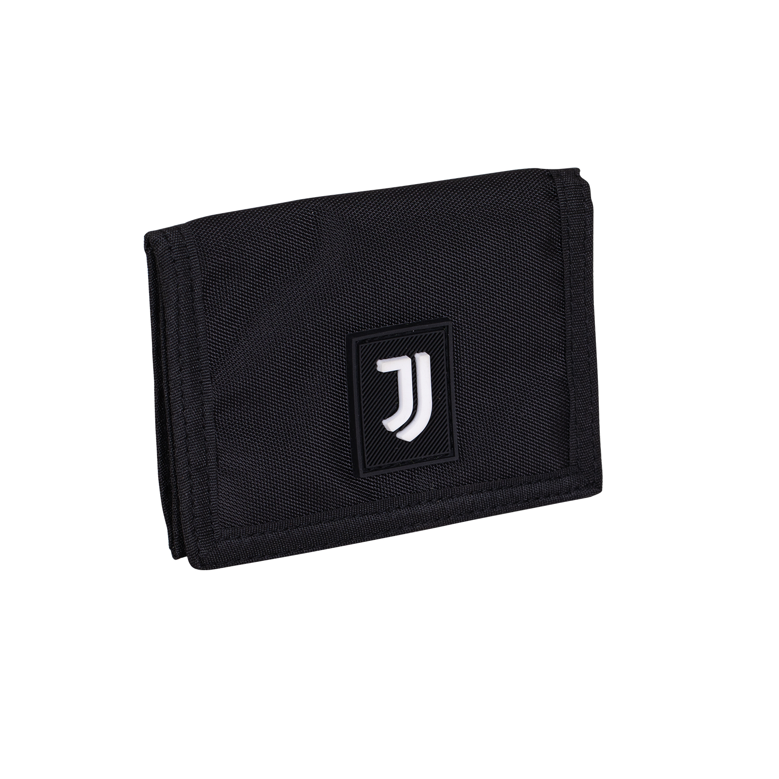 Portafoglio in poliestere nero con chiusura a strappo e logo Juventus gommato.