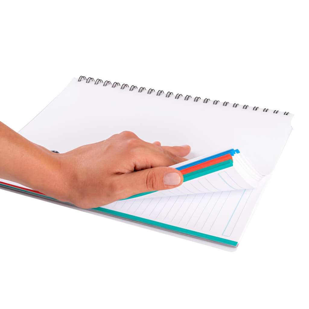 I fogli sono realizzati in carta certificata, dotati di preforature per lo strappo e presentano bordi e rigature di diverse tonalità, ideali per catalogare e individuare rapidamente gli appunti.