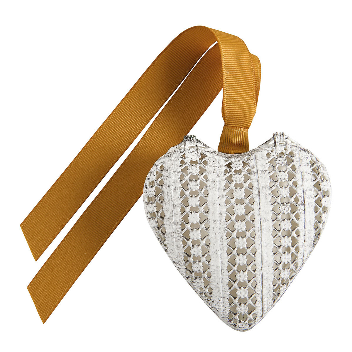 Questo cuore decorativo in metallo aggiungerà un tocco di romanticismo e raffinatezza alla tua casa. Ispirato al fascino vintage, presenta dettagli cesellati di squisita fattura e racchiude un grazioso cuore in gesso profumato. Un delicato nastro completa il design, donando un’allure femminile ed elegante, in linea con lo spirito raffinato di Mathilde M.