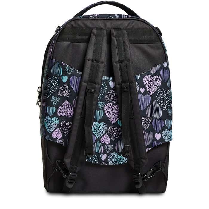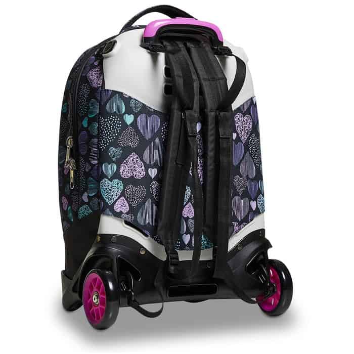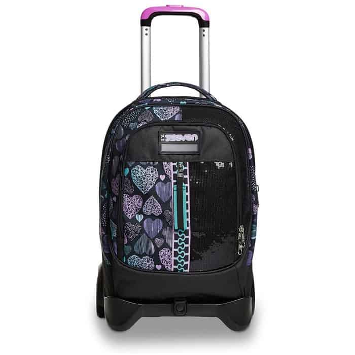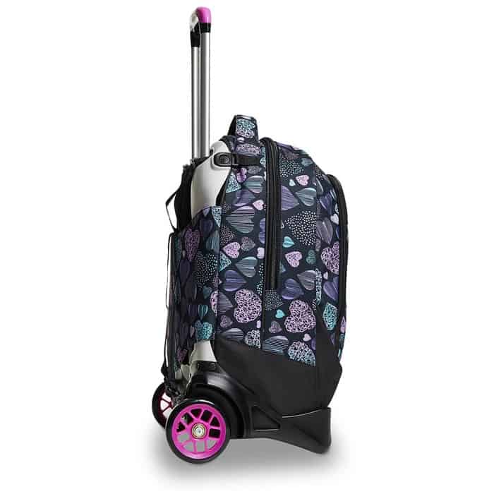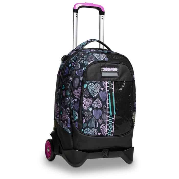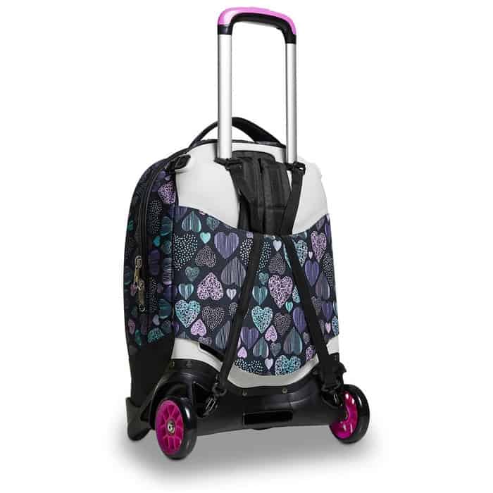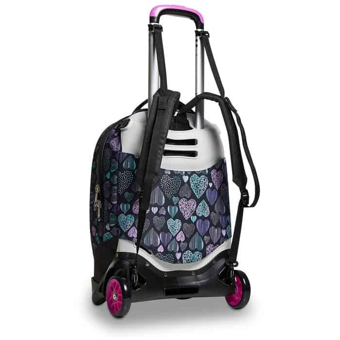 Trolley scomponibile con maxi ruote da 10 cm, Crossover System con clips per l’aggancio dei nastri, doppia barra telescopica con due regolazioni in altezza, fondo rinforzato e protezioni angolari. 3 possibili utilizzi: 1) uso trolley con spallacci a scomparsa totale nello schienale; 2) uso zaino senza sganciare il carrello; 3) uso zaino quando completamente sganciato dal carrello (zaino lavabile)