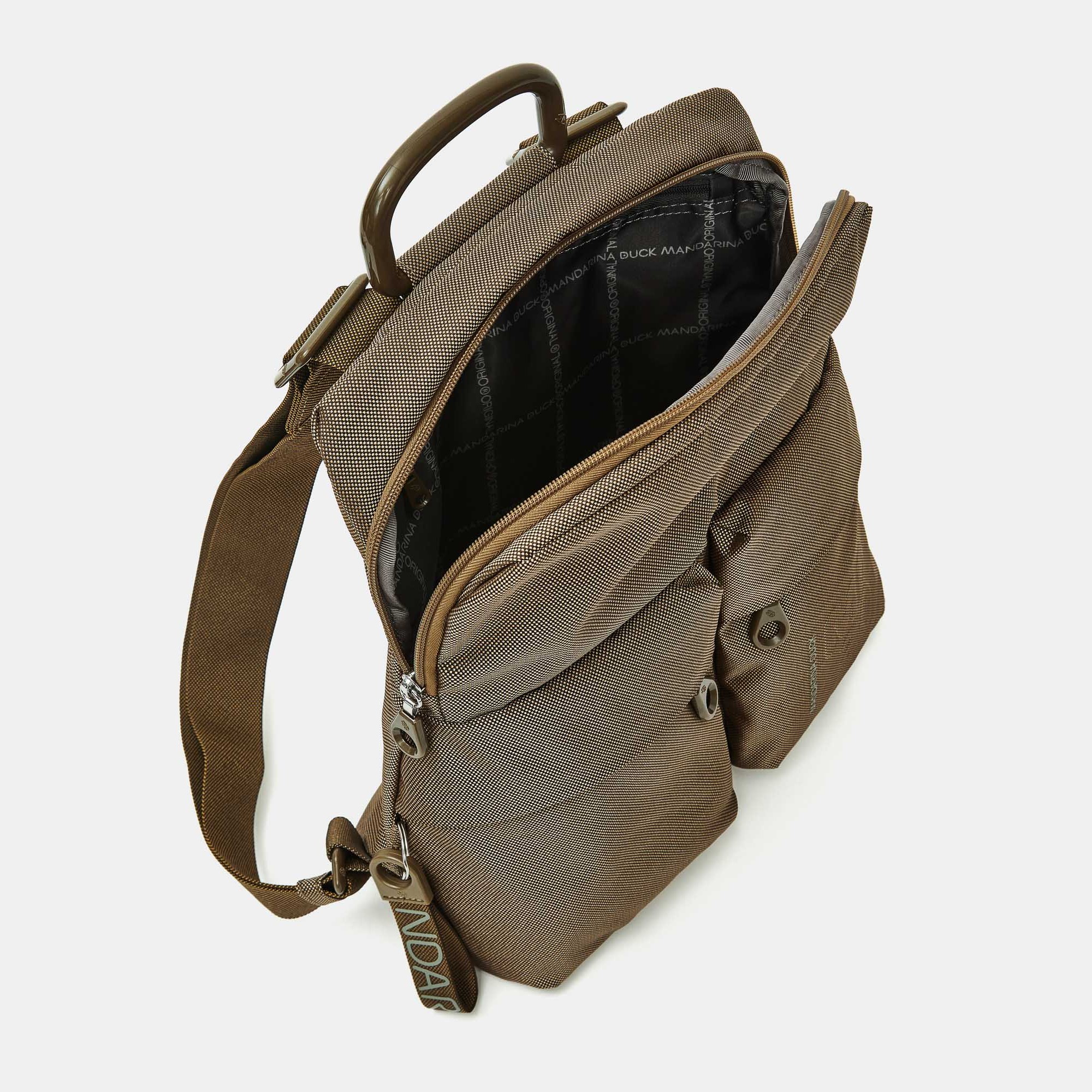 Zaino realizzato in mitrix, storico materiale del marchio Mandarina Duck. Leggero, versatile e connotato da un originale effetto cangiante. Gli spallacci regolabili uniti alle tasche zippate interne ed esterne lo rendono comodo e funzionale. Il restyling degli accessori ha reso il suo aspetto più moderno e contemporaneo.