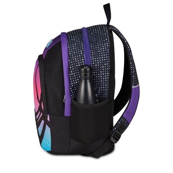 All’interno troviamo una tasca dedicata al computer, mentre ai lati ci sono due tasche: una dotata di chiusura con zip e l’altra in rete, ideale per contenere una borraccia.