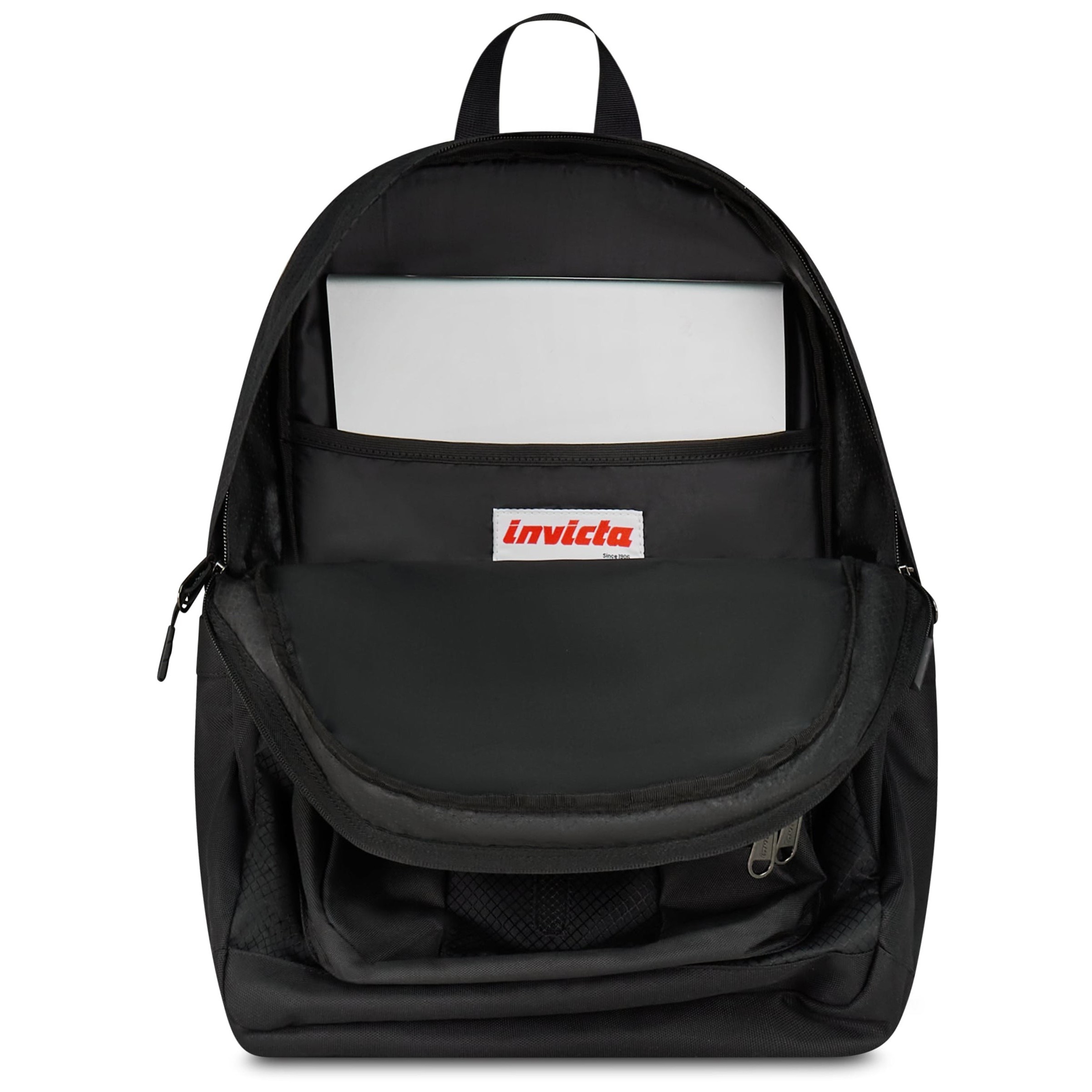 Dispone di due scomparti, una luce LED frontale rimovibile con pulsante on/off. Il fondo interno è rinforzato e apribile a ribalta, con una cerniera personalizzata e il logo Invicta ricamato.