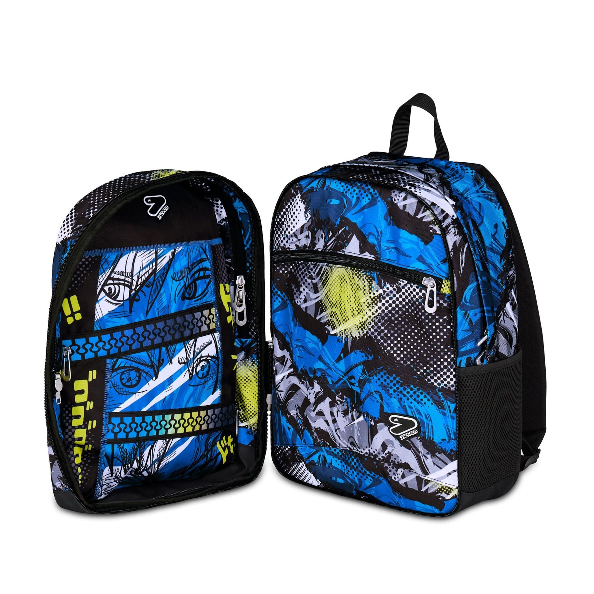 Zaino con doppio scomparto e una parte frontale che si può staccare e ribaltare, offrendo tre modalità di utilizzo: uno con fantasia originale, uno con un unico scomparto e uno con fantasia manga.