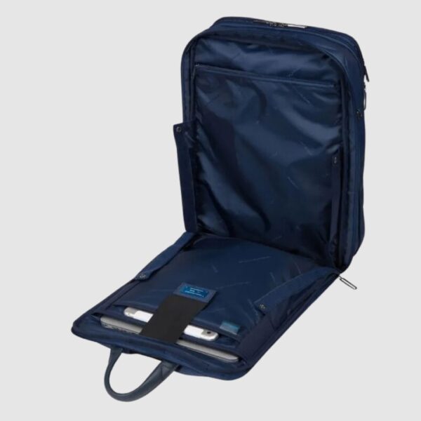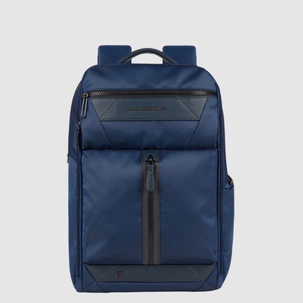 Zaino Piquadro ideale per lavoro e tempo libero, realizzato in tessuto e pelle riciclati. Dotato di scomparto imbottito per PC 14″ e tablet, e sistema di aggancio al trolley.