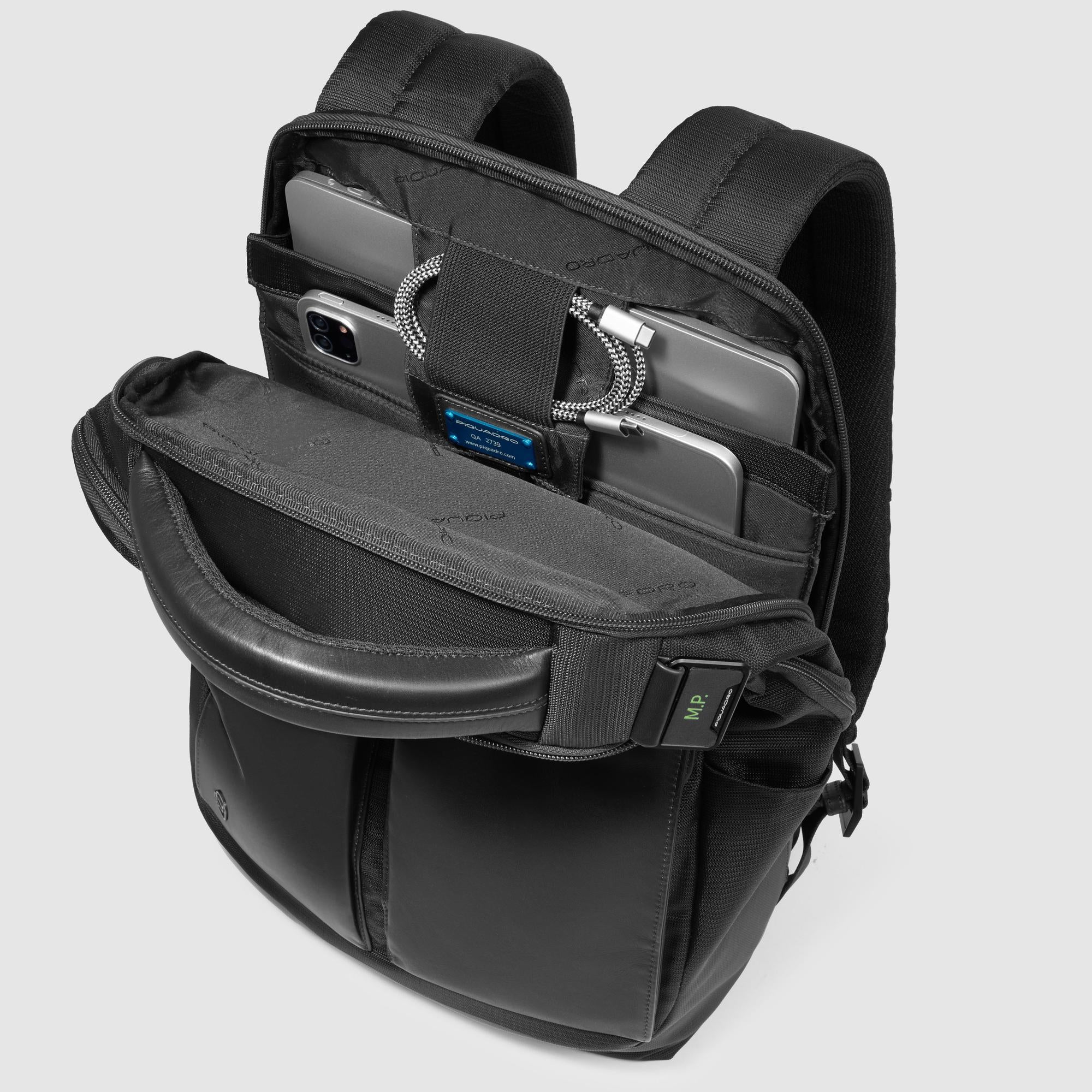 Zaino uomo porta pc o iPad®Pro 12,9″ in tessuto riciclato e pelle a due scomparti con protezioni antiurto e anti RFID e tasca per AirPods®