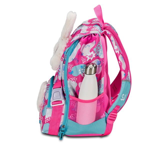 - Tasche: Tasca frontale, tasca su pattina, tasca in rete porta borraccia e taschino trasparente con inserti di peluche che contiene un portachiavi gattino estraibile